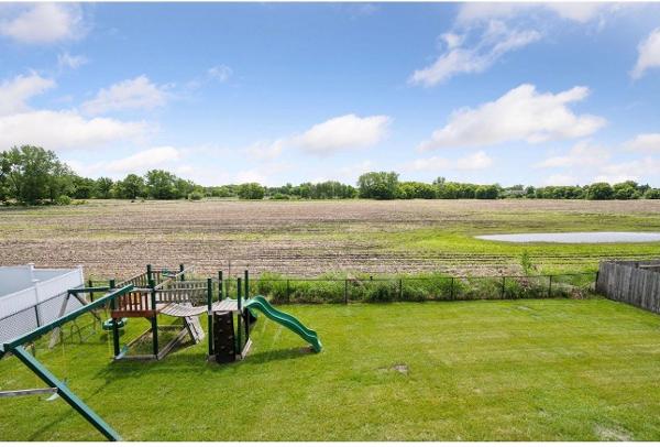 Relaxing patio area and private backyard with scenic field views